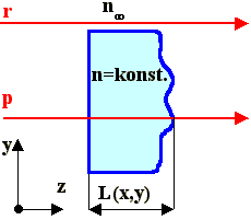 Na obr. 17-2 je typický transparentní objekt proměnné tloušťky L(x, y) s konstantním indexem lomu n = konst., který bývá obvykle z jedné strany rovinný, což lze u tekutin provést přiložením planparalelní desky (rovinného zrcadla) k měřenému objektu.