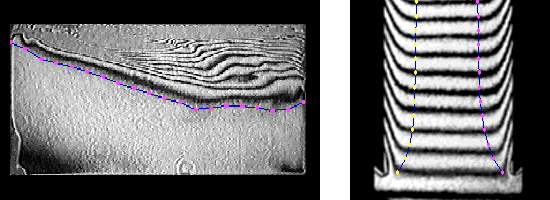 Nejjednodušší aplikací interferometrie transparentních objektů je měření obrysů objektů ve směru kolmém na šíření světelných paprsků. Používají se přitom interferometry s jedním pohledem na zkoumaný objekt, viz kap. 13.2 až 13.9. Obrysy objektů jsou na interferogramech v místě, kde dochází ke změně indexu lomu vůči okolí, čímž dojde také ke změně interferenčního řádu vůči okolí. Příklady interaktivního určení obrysů transparentních objektů jsou uvedeny na obr. 17-3. Vlevo je interferogram teplotního pole v modelu místnosti při zátopu otopným tělesem, viz také příloha P22, kdy interferometr je seřízen na nekonečnou šířku interferenčních proužků v referenční oblasti. Je zřejmé, že při tomto seřízení interferometru nelze přesně určit obrys či hranici nehomogenního teplotního pole, která se nachází někde v místě mezi homogenním prostředím a prvým tmavým interferenčním proužkem. Vpravo je interferogram teplotního pole při laminární přirozené konvekci ve vzduchu mezi vertikálními vyhřívanými deskami otopných těles ve vstupní části, a to při seřízení interferometru na konečnou šířku proužků v referenční oblasti. Při tomto seřízení interferometru lze velmi přesně určit hranici tepelných mezních vrstev, jelikož jsme schopni určit exaktně místo, kde změna interferenčního řádu dosahuje libovolnou smluvní hodnotu definující hranici.