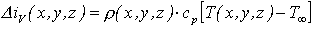 Změnu celkové entalpie ve sledovaném prostoru lze vyjádřit pomocí změny objemové hustoty entalpie viz rovnice (18-22). S využitím vztahu (18-8) z kap. 18.2 pro konstantní tlak p můžeme rovnici (18-25) pro výpočet změny objemové hustoty entalpie upravit do tvaru
