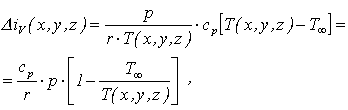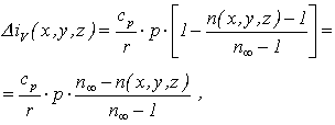 kde r je plynová konstanta a p je tlak, který považujeme za konstantní. Je zřejmé, že výpočet rozložení změny objemové hustoty entalpie D iv(x, y, z) můžeme provést z rozložení teplot T(x, y, z), které lze z interferogramů vyhodnotit, jak je to pro ideální plyny uvedeno v kap. 18.2.