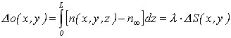 Z rovnice (17-1), viz kap. 17.1, pro změnu optické dráhy Do(x, y) při přímočarém průchodu paprsků trojrozměrným objektem a z rovnice (17-2), viz kap. 17.1, definující změnu interferenčního řádu DS(x, y) pro vlnovou délku l lze vyjádřit změnu optické dráhy ve tvaru