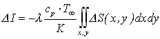 Dosazením rovnice (18-28) a integrálu z rovnice (18-29) do rovnice (18-27) dostaneme změnu celkové entalpie ve sledovaném prostoru jako funkci integrálu změny interferenčního řádu přes celý průmět sledovaného prostoru v rovině pozorování x-y ve tvaru