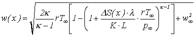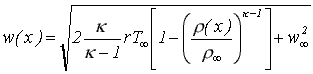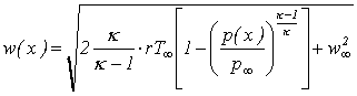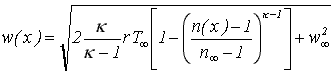 kde woo, w(x) jsou rychlosti plynu na proudnici v referenčním místě a v místě x, poo, p(x) jsou statické tlaky na proudnici v referenčním místě a v místě x, Too je teplota plynu na proudnici v referenčním místě, r je plynová konstanta a k je Poissonova konstanta pro adiabatické proudění (nebo exponent polytropy u polytropického proudění). Vyjádříme-li poměr tlaků v rovnici (18-37) poměrem hustot dle vztahu (18-15) z kap. 18.3, dostaneme