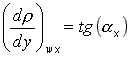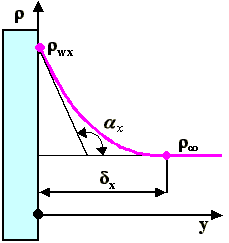 Lokální rozdíl hustot (rwx - roo ) přenášené látky pro rovnici (18-97) je možné stanovit z naměřeného či vypočteného tvaru profilu hustot. Lokální derivaci hustoty u povrchu (dr /dy)wx je možné stanovit z funkce popisující profil hustot, či z naměřeného a vykresleného profilu hustot (obr. 18-14), a to pomocí úhlu ax, který svírá tečna k profilu koncentrace v místě povrchu s osou y. Pro lokální derivaci hustoty u povrchu ve směru kolmém k povrchu pak platí