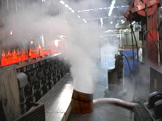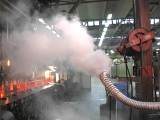 Obraz 4: Zviditelnění proudění ve sklárnách nad podlahovým roštem mezi dvěma výrobními linkami.