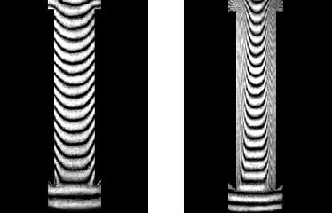 Příklady zaznamenaných interferogramů teplotních polí při přirozené konvekci ve štěrbinách mezi vertikálními deskami jsou uvedeny na obrazech 1 a 2. Záznam interferogramů byl prováděn CCD kamerou do počítače. Interferometr byl při těchto experimentech seřízen na vhodnou konečnou šířku horizontálních interferenčních proužků v referenční oblasti. Toto seřízení umožňuje přesně určovat hranice tepelné mezní vrstvy i při vyšších teplotách povrchů desek, kdy dochází k zániku interferenčních proužků u povrchu. Z tlouštěk tepelných mezních vrstev (viz kap. 18.13 a kap. 11.4) a z průběhu teplot uprostřed štěrbiny (viz kap.18.2) lze pak vyjádřit lokální hodnoty a následně i střední hodnoty přestupu tepla.