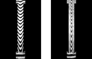 Na obrazu 2 jsou teplotní pole ve štěrbině šířky 16 mm. Na levém interferogramu je záznam při teplotě povrchů desek 20°C a teplotě okolí 15,5 °C. Na pravém interferogramu jsou teploty povrchů desek 75°C a teplota okolí 16 °C.