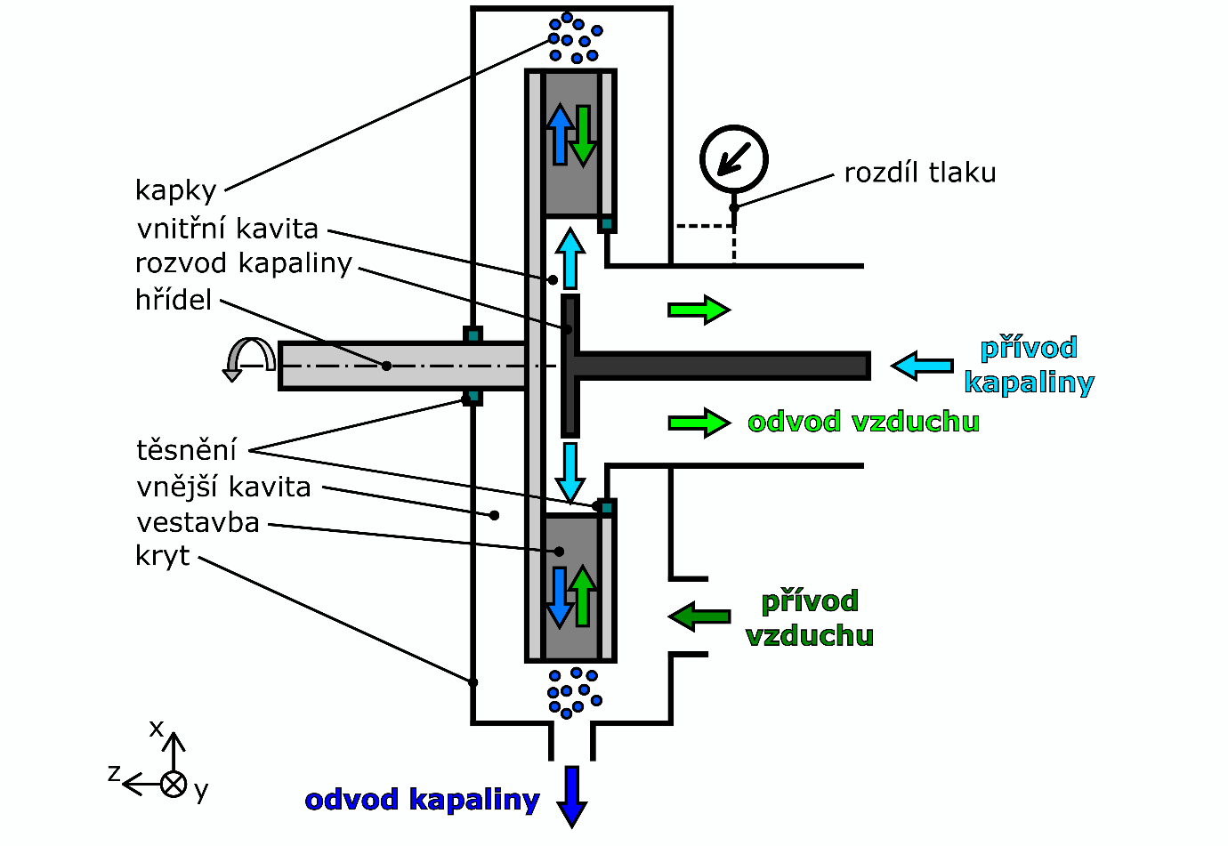 Rotační absorbér je technologie pro intenzifikaci procesů s uplatněním nejen při záchytu CO2, ale i pro destilaci či míchaní substancí. Základním principem zařízení je vytvoření velkého mezifázového rozhraní mezi tekutinami, typicky kapalinou a plynem. Následující Obrázek 1 ukazuje typické protiproudé uspořádání rotačního absorbéru, kde je kapalina přivedena na vnitřní povrch rotující porézní vestavby, skrz kterou protéká, atomizuje se na kapky a vytváří kapalinový film a různé další struktury. Na výstupu z vestavby jsou vymrštěné kapky, které letí prostorem vnější kavity, než narazí na kryt. V této části zařízení se také nachází přívod vzduchu, který díky rozdílům tlaku proudí skrz vestavbu v protiproudu ke kapalině.